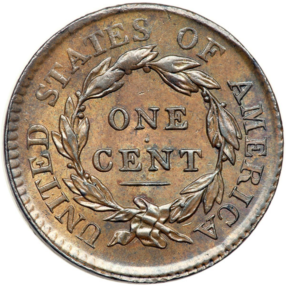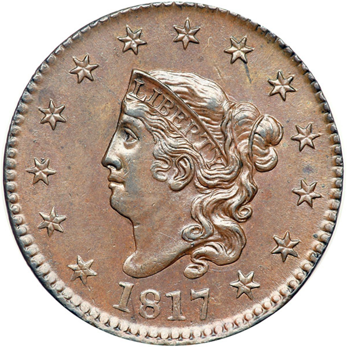 1817 N-5 R3 AU58. Choice lustrous medium brown and light olive with slightly darker steel brown toning on the highpoints. Great eye appeal, just a hint of friction on the highest points from mint state. The best identifying marks are a tiny streak of darker toning down from the lower right point of star 8 and a small spot of similar toning over star 11. Nicely struck E-MDS showing radial lines in all the stars and very fine radial die flowlines in the fields. The repunching on the left base of the N in ONE is strong and most of the dentils on the reverse are visible. Called AU55 net AU50 and tied for CC#14 in the Noyes census, his photo #25221. Removed from an NGC slab graded MS62BN (NGC label included, #509388-001, and it shows the attribution and Rasmussen provenance). A beautiful cent that comes with an important provenance.