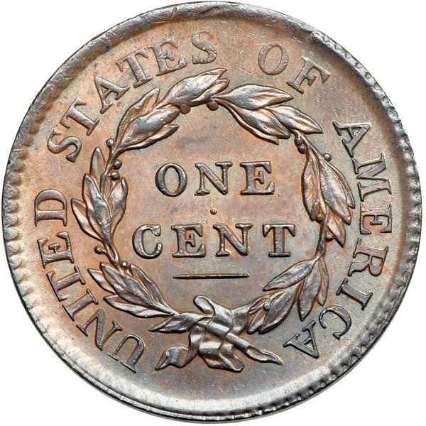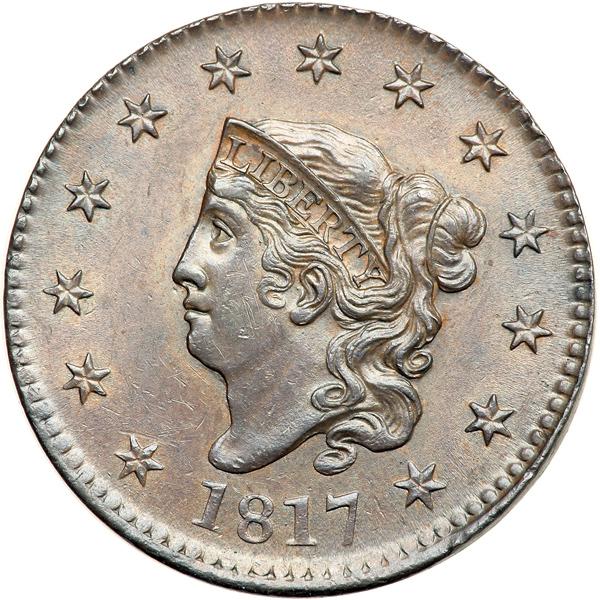 1817 N-5 R3. PCGS graded MS-63 Brown. An attractive cent with excellent luster and eye appeal, but there are a few minor contact marks, including some faint scratches on the cheek. Frosty light steel brown with slightly darker steel brown toning on the highpoints and lighter reddish steel brown faded down from mint color in protected areas. No spots or stains. MDS with fine radial die flowlines covering the fields on both sides and most of the dentils still visible. There are no significantly different die states for this variety, which is the product of two previously used dies (obverse of N-17 late and reverse of N-4 and N-14, late). Called MS60 net AU55 and tied for CC#7 in the Noyes census, his photo #22351. Our grade is AU55. Pop 1; 1 in 64. Only 2 graded at PCGS for the variety. DWH #2506 (PCGS # 36562) .
