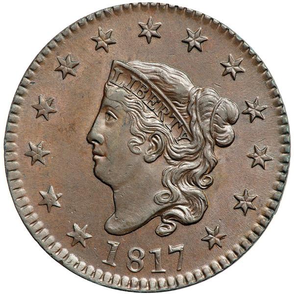 1817 N-6 R1 AU55. Very attractive frosty steel and light chocolate brown. No defects, only a hint of friction on the highest points of the design. A sharp, premium example that offers mint state eye appeal. E-MDS.