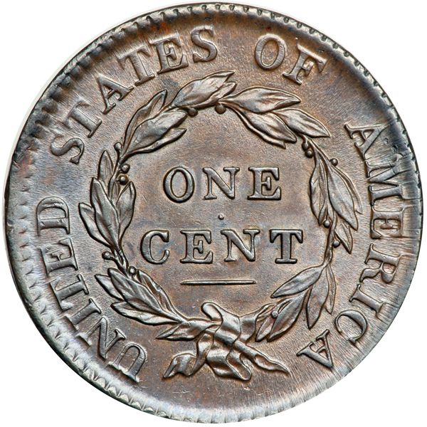 1817 N-6 R1 MS62. Lustrous bluish steel and chocolate with lighter brown tones in protected areas on the obverse. The surfaces are satiny and this cent offers excellent eye appeal. The only mark is a small splash of slightly darker toning under the E in STATES. MDS. Most of the dentils remain visible on both sides but the outer star tips are starting to flow toward the rims. Called MS60+ by Noyes, his photo #56014.