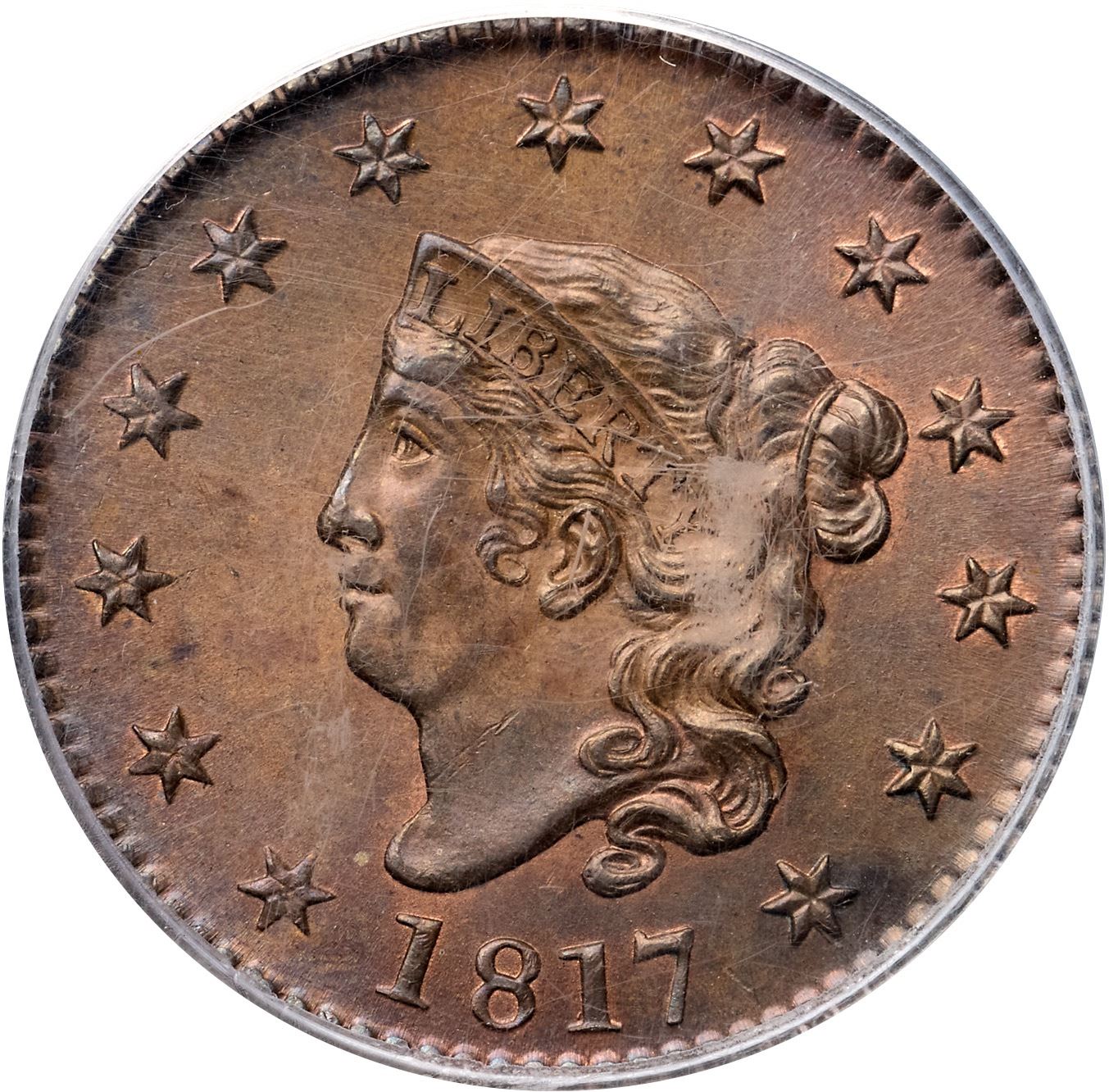 1817 N-6 R1 PCGS graded MS65BN, CAC ApprovedHighly lustrous bluish steel brown with 10-15% of the original mint color remaining, mostly on the reverse. The surfaces are satiny, the strike is sharp, and this cent has outstanding eye appeal. A puff of slightly darker toning right of star 13 and a dull contact mark on the upper lip, and another hidden in the hair below the left edge of star 8 are the only marks. Neither of the tiny contact marks is visible to the unaided eye. EDS, die state a. The dentils are sharp and delicate repunching is visible at the bottom of the N in ONE and bottoms of the C & N in CENT. Called MS65 and tied for finest known in the Bland census. Noyes says MS62 and tied for CC#7, his photo #21728. Our grade is MS63. Another very nice cent.Certificate Number: 36565.65/13094328Pedigree: Ex T. James Clarke 1948-Willard C. Blaisdell )via Del Bland 9/1976-R. E. "Ted" Naftzger, Jr.-Naftzger Estate, McCawley & Grellman Auctions/Goldbergs 2/1/2009:26-Terry S. Denman Collection