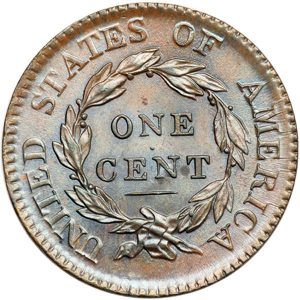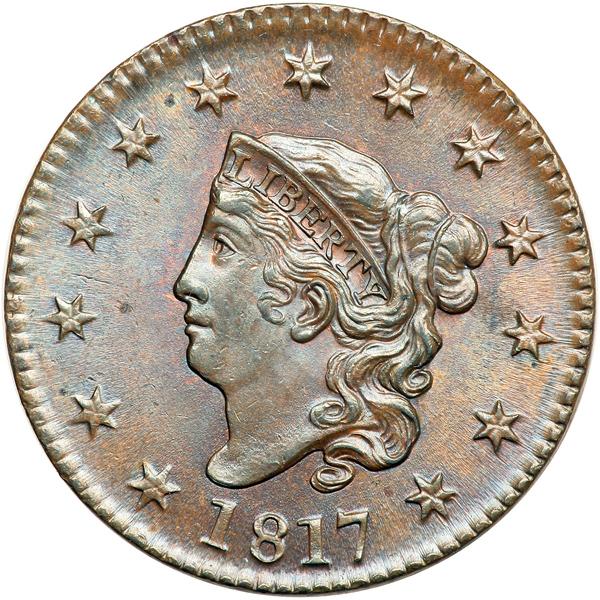 1817 N-6 R1. PCGS graded MS-65 Brown. Lustrous light bluish steel brown with traces of faded mint red remaining on the obverse. The surfaces are satiny and the eye appeal is excellent, very close to choice. The only marks are a speck of dark toning right of star 3, another left of star 6, and a third between the N & T in CENT. Kept from choice by a tiny, barely visible scuff on the curl before the ear. MDS. The fields are covered with fine radial die flowlines and the dentils are starting to weaken, although they remain complete around both sides. Struck very slightly off center to K-6. Removed from an NGC slab graded MS65BN (NGC label included). Previously removed from a PCGS slab graded MS64 Brown (PCGS label included). Called MS63 by Noyes and tied for CC#2 in his census, photo #31007. Our grade is MS62. Pop 3; Only 4 graded at PCGS for the variety. DWH #2575 (PCGS # 36565) .