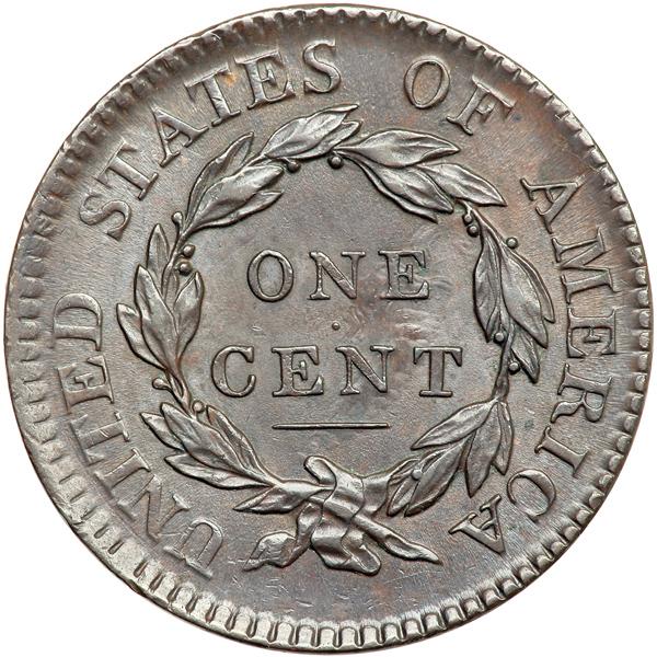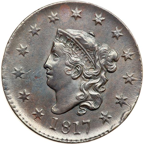 1817 N-7 R3+. Mouse Top. EF-45. Five points sharper with some small, very shallow pitmarks or planchet voids in the field off the chin. Glossy bluish steel and chocolate brown with some darker chocolate and olive toning in the aforementioned roughened area in the field off the chin and a splash of lighter chocolate toning left of star 7. Otherwise the surfaces are very nice, free of any notable defects and covered with attractive frosty flowline luster. Terminal die state with strong cud breaks at the rim from star 12 to star 13. The "Mouse" break on top of the head is strong and the fine obverse die cracks of the earlier state are slightly stronger. DWH #2507.