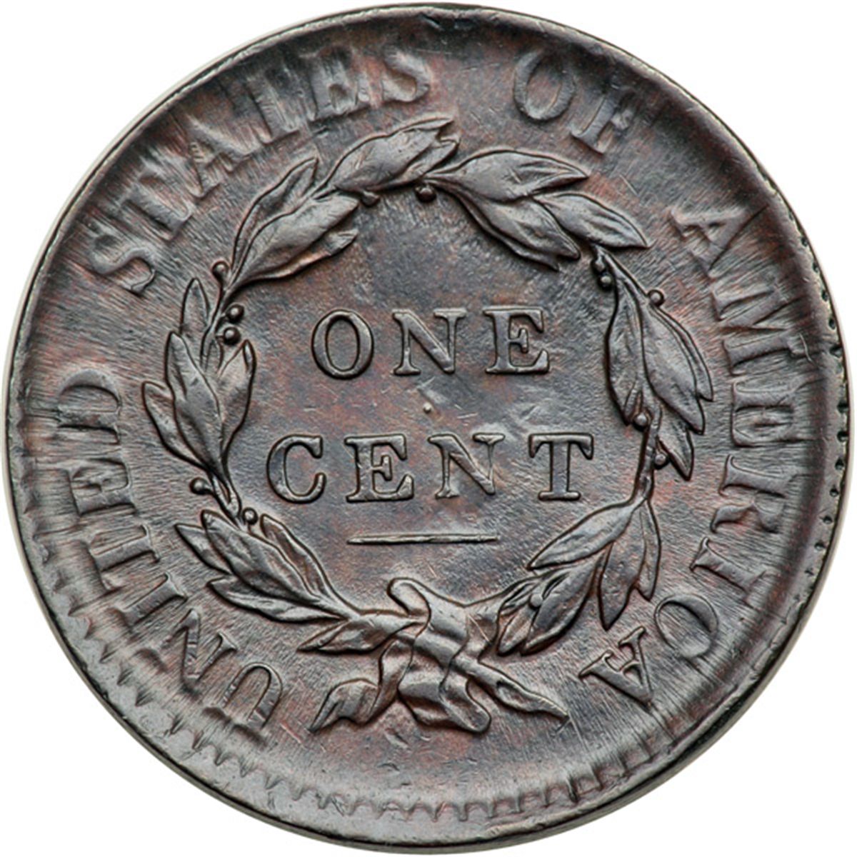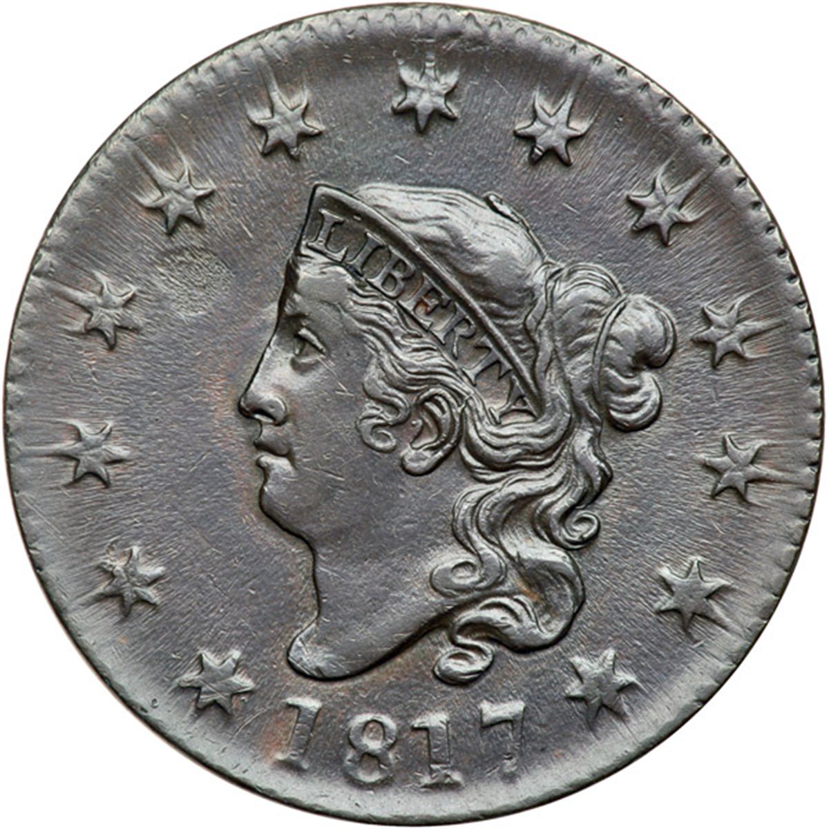 1817 N-8 R2 EF45+. Mouse Top. Glossy dark chocolate and olive brown with traces of reddish steel brown faded down from mint color in protected areas on the reverse. The only marks are a few tiny ticks on the tip of the bust and a very small planchet lamination void on the rim just right of the second S in STATES. The toning is a bit dark but the details and luster are consistent with an AU50 example. LDS with a full "Mouse" break reaching up to the left from the top of the head under star 8. This is the so-called "Finger Mouse" since it is shaped more like a finger than a rodent, but the rodent name sticks since it is located in the same place as the other "Mouse" breaks seen on 1817 cents. The shallow depression that forms in the field under star 5 is obvious.