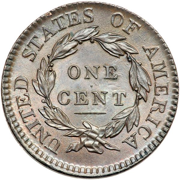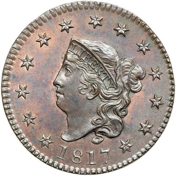 1817 N-8 R2. PCGS graded MS-65 Brown. Lustrous bluish steel brown and chocolate with underlying faded mint red covering 20% of the obverse and faint traces remaining on the reverse. Would rate a higher grade if not for some very fine carbon hidden in the curls at star 13, and some of the carbon extends into the field towards star 12. A small spot of very fine carbon in the middle of the jawline and a tiny planchet flake in the dentils over the second T in STATES are the other notable marks. Sharply struck EDS with smooth, slightly reflective fields on the obverse and no trace of the tiny "Mouse break" that forms later on the top of the head. Excellent eye appeal in spite of the minor defects. Graded MS60+ and tied for CC#5 in the Bland census. Called MS60 net AU55 in the Noyes census, his photo #56704. Our grade is MS60 Plus. Pop 3; None finer at PCGS in Brown for the variety. DWH #2576 (PCGS # 36571) .
