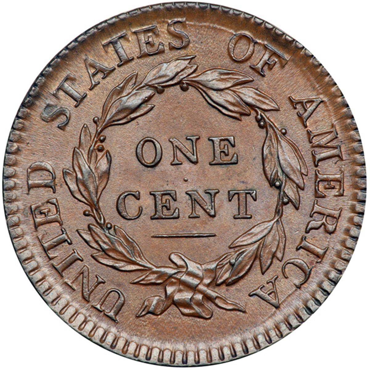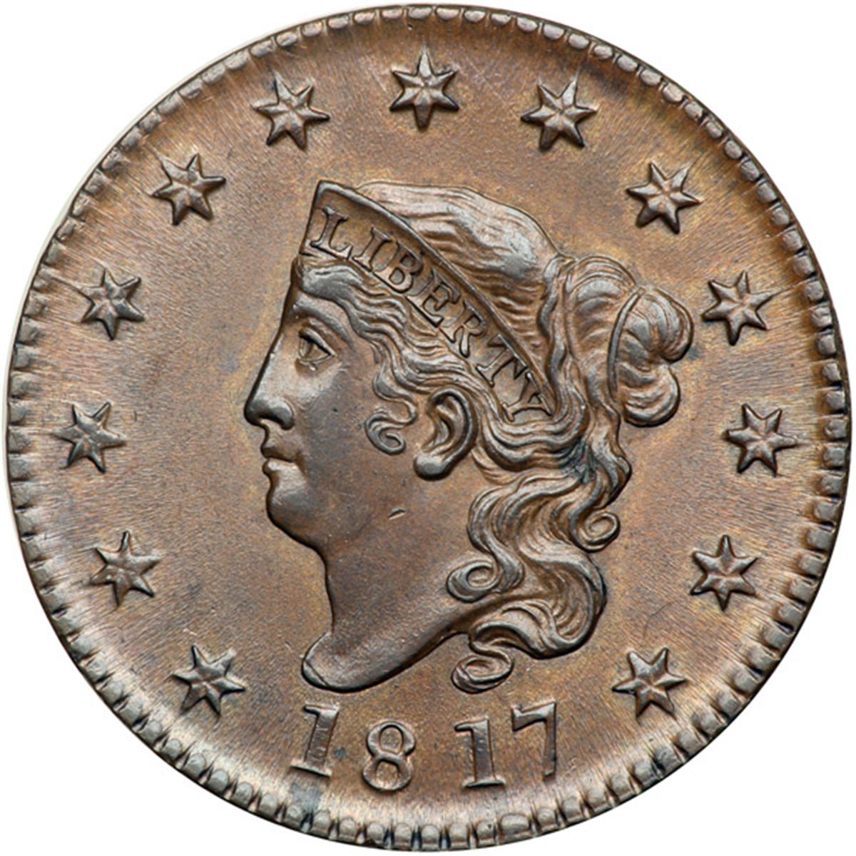1817 N-9 R2 AU58. Lustrous light steel brown with darker steel brown toning on the highest points of the designs. Tiny peeps of mint color can be found on both sides. Great eye appeal for the grade, about as close to mint state as you can get for an "AU" cent. Sharply struck MDS. The dentils around both sides are clear but there is no trace of the "Mouse" break on top of the head. The nearly vertical die line at the right foot of the first 1 is gone and the vertical line at the throat is weak but still visible. A tiny pinprick on the midpoint of the jawline is a good identifying mark. Called AU55 in the Noyes census, his photo #27226. Removed from a PCGS slab graded MS64BN (old green PCGS label included, #1594.64/7422179).