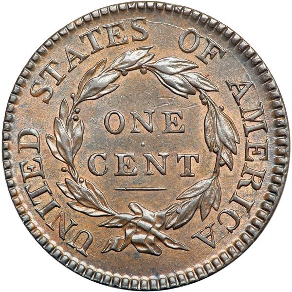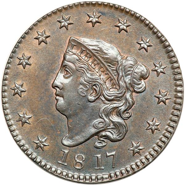 1817 N-9 R2. PCGS graded MS-63 Brown. Very attractive offering mint state sharpness, but there is a very faint hairline scratch arcing above star 1 and another slanting down to the left through the T in CENT, plus a trio of shallow contact marks over the E in ONE. Otherwise this cent is choice and the eye appeal is excellent. Lustrous steel brown and chocolate with frosty faded mint color in protected areas on both sides. Sharply struck E-MDS, before any trace of the Mouse break on top of the head under star 8. Called AU50 in the Noyes census, his photo #37224. Our grade is AU50. Pop 2; 1 in 64; 1 in 66. DWH #0414 (PCGS # 36574) .