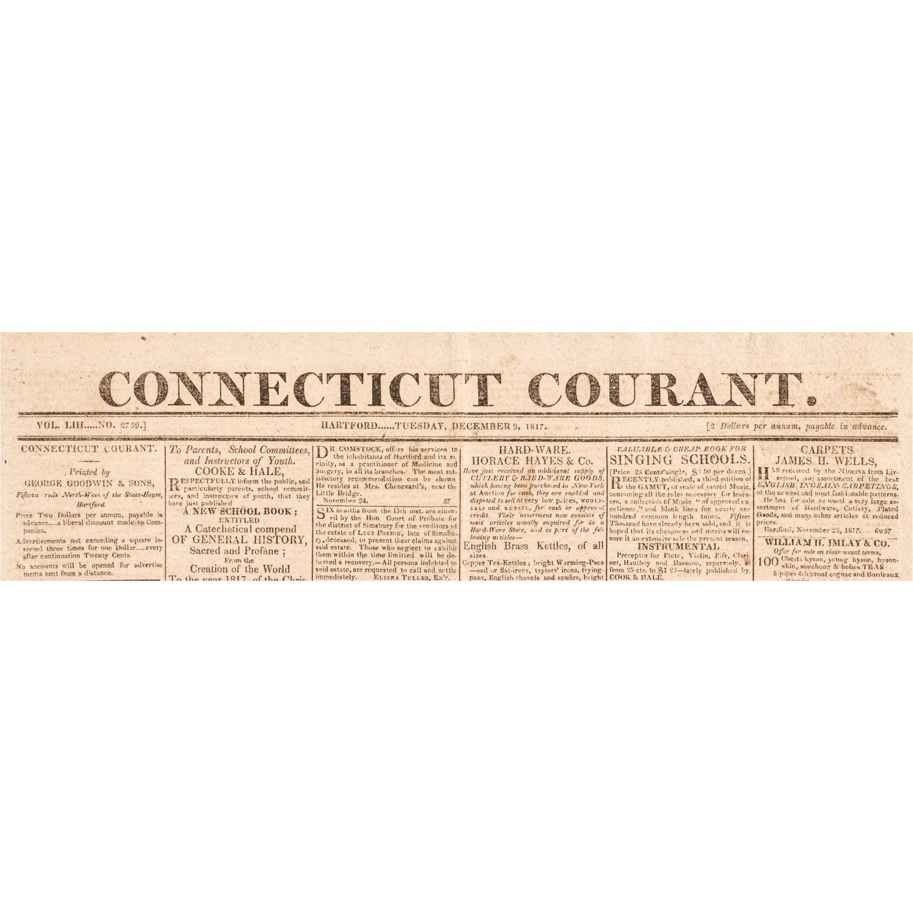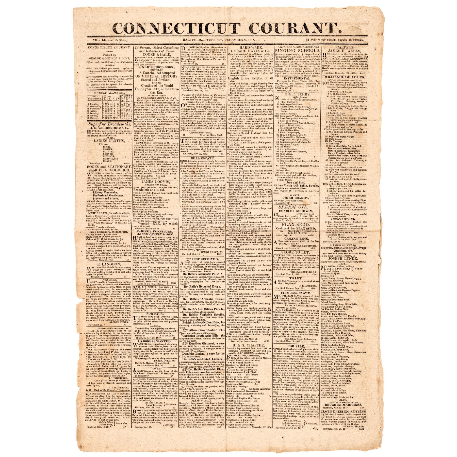 December 9, 1817-Dated, Complete 4-page issue of the "Connecticut Courant" Newspaper, Hartford, Ct., with a page 2, Full printing of President James Monroe's First Annual Message to Congress (State of the Union Address), Choice Very Fine.