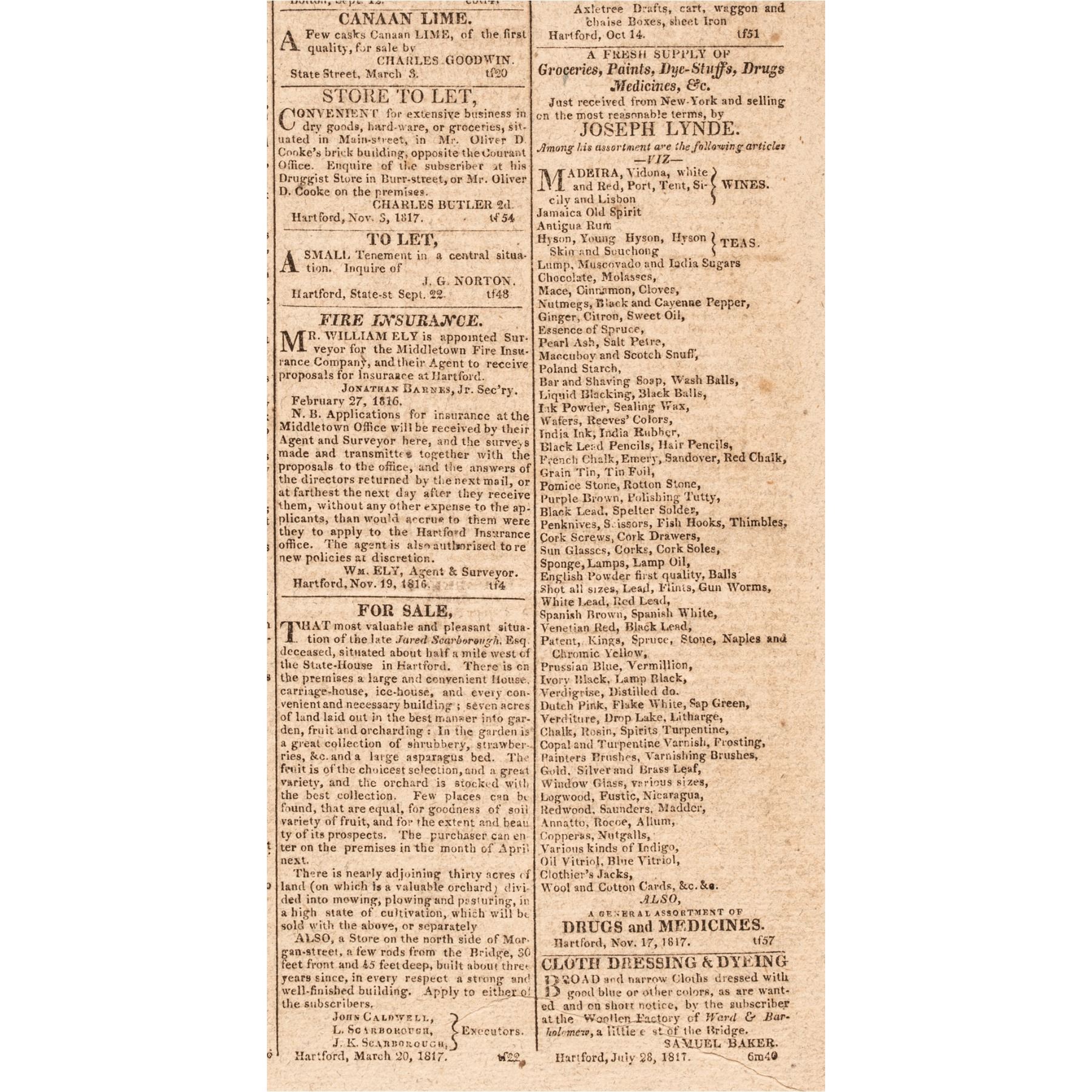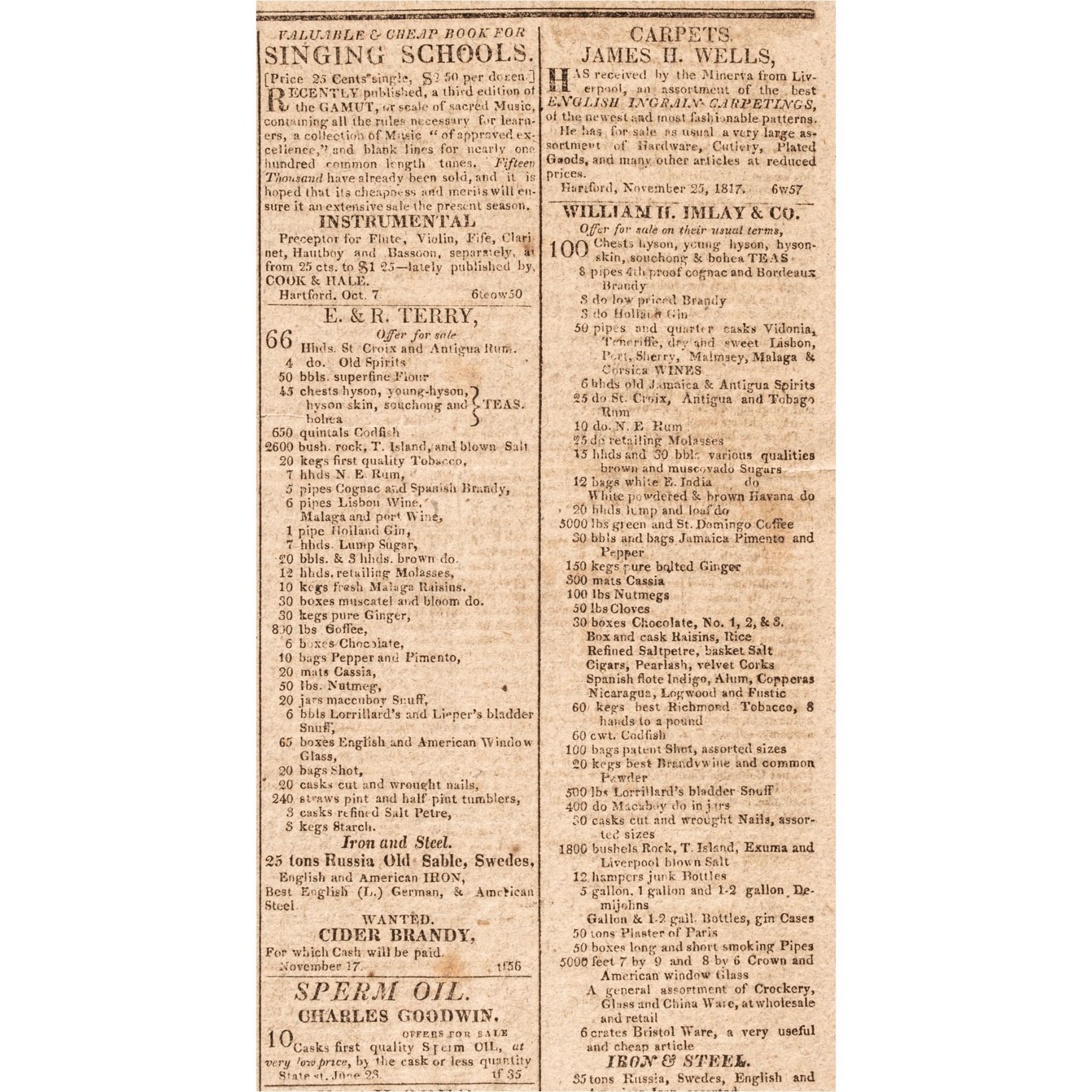 December 9, 1817 issue of the "Connecticut Courant", Hartford, Ct., 4 pgs., about 14.5" x 21", with a page 2, Full printing of President James Monroe's First Annual Message to Congress (State of the Union Address) in which he discusses relations with Britain and Spain, Territorial disputes in Florida and Texas, including referring to the capture of Amelia Island, Fla. by mercenaries led the Gregor McGregor; he also outlines the state of the Treasury and the military in some detail, discusses treaties with Indians, and more. Signed in type by James Madison and “Mis-dated” by a decade by printer error as “Dec. 2, 1827” instead of 1817! A pleasing historic content newspaper including an advertisement by “WILLIAM H. IMLAY & CO”, Imlay who is noted for his signing "United States Loan-Office" Bonds c. 1793, as Commissioner for the State of Connecticut. (We sold one of the bonds made out to Elisha Colt in June 2019 for over $1,500.)
