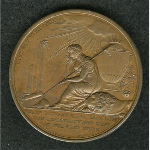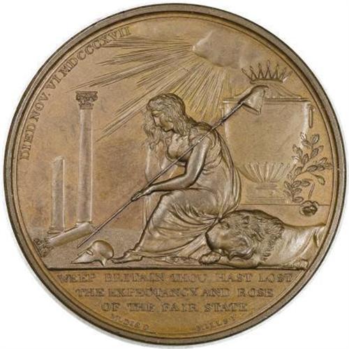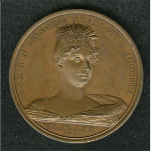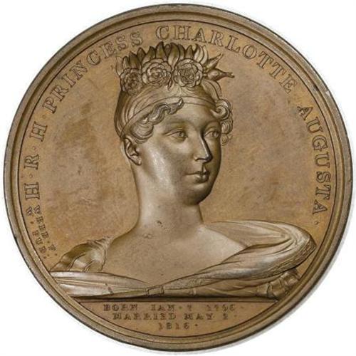 <B>1817 Princess Charlotte Augusta Medal.</B></I> Bronze, 49 mm, 61.2 gm. Commemorating the untimely death of Princess Charlotte Augusta, born Jan. 7, 1796, wed May 2, 1816, died Nov. 6, 1817. Obverse: 3/4 facing bust right of the young princess. Britannia and English lion mourn, with crowned funeral urn in background. Dies by Webb and Mills. Unworn with minimal carbon and only a few unimportant marks.<BR><BR><b>Shipping:</b> Coins & Currency (<a target="_blank" href="http://www.heritageauctions.com/common/shipping.php">view shipping information</a>)