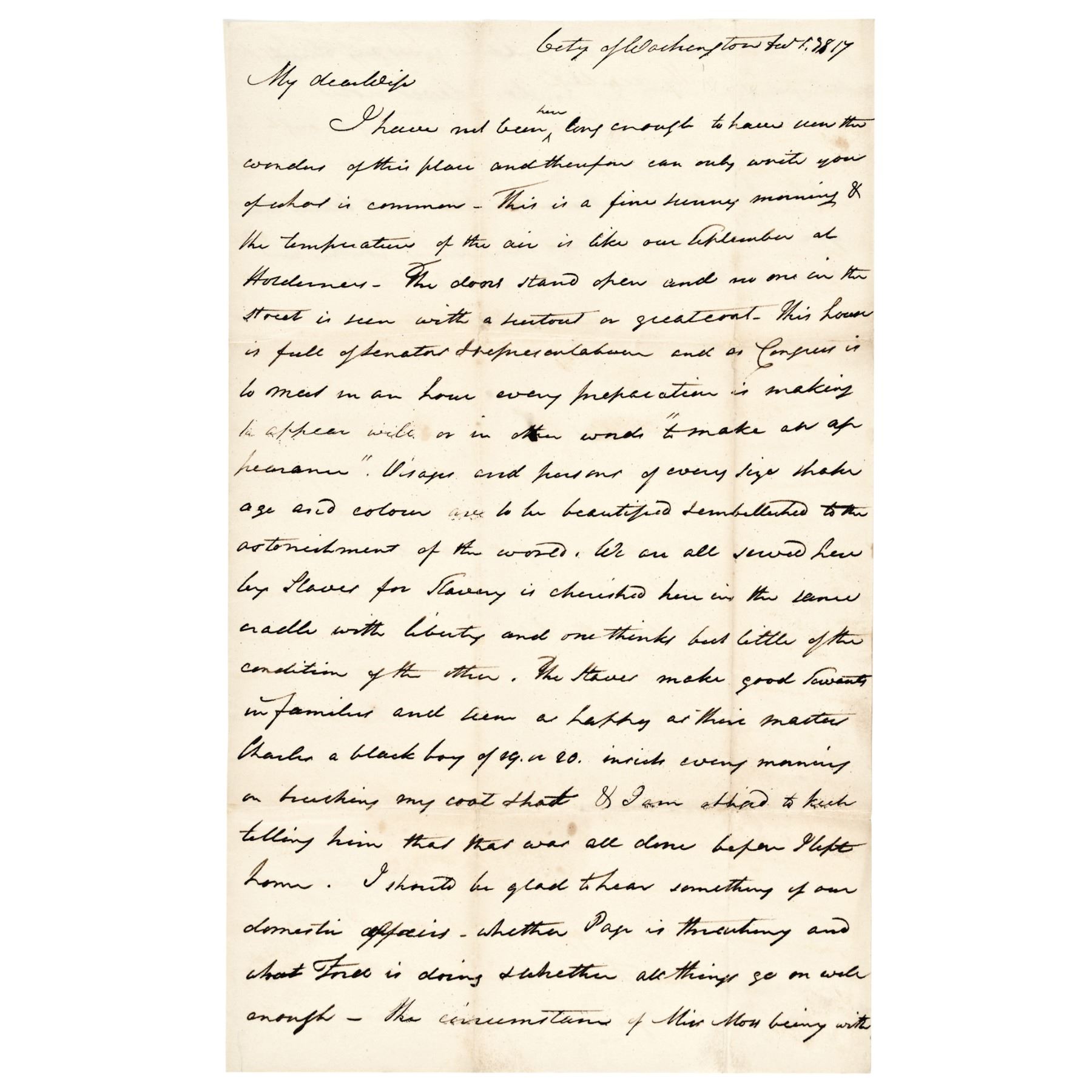 “... to make an appearance… Visages and persons of every size, shape, age and colour are to be beautified and embellished to the astonishment of the world.” But what most struck this New England Yankee, "We are all served here by Slaves, for Slavery is cherished here in the same cradle with liberty and one thinks but little of the condition of them. The slaves make good families and seem as happy as their master. Charles a black boy of 19 or 20 insists every morning on brushing my coat & hat and I am obliged to keep telling him that that was all done before I left home…”