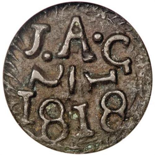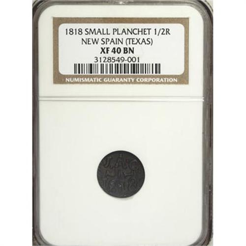 <B>1818 1/2RL New Spain (Texas) Jola Half Real, Small Planchet XF40 NGC.</B></I> Breen-1082, numerator near G. At least four sets of dies are known for the Small Planchet Jola, since the present die variety differs from the Breen plate coin, the 2008 <I>Guide Book</B></I> plate coin, and the most recent Heritage auction appearance (2007 ANA, lot 1524). Interestingly, on the present piece, the star is incused within a raised circular area. The dark brown surfaces are mildly granular from environmental exposure, as is the case for all examples seen. The initials JAG correspond to the San Antonio-area postmaster, Jose Antonio de la Garza. Listed on page 74 of the 2008 Guide Book.<BR><BR><b>Shipping:</b> Coins & Currency (<a target="_blank" href="http://www.heritageauctions.com/common/shipping.php">view shipping information</a>)