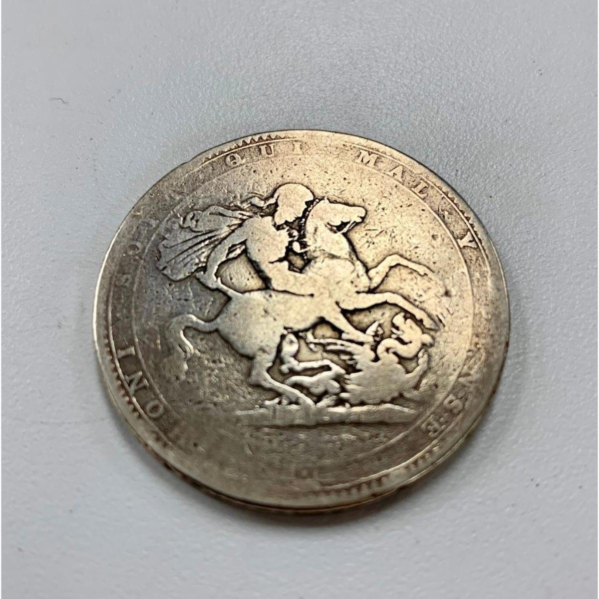 Obverse Laureate portrait of King George III right, legend around, date below. Lettering: GEORGIUS III D:G: BRITANNIARUM REX F: D: P I S T R U C C I 1818 Translation: George the Third by the Grace of God King of the Britains Defender of the Faith Engraver: Benedetto Pistrucci Reverse St. George slaying the dragon right within Garter, legend around. Lettering: HONI · SOIT · QUI · MAL · Y · PENSE. P I S T R U C C I Translation: Shame on he who thinks evil of it Engraver: Benedetto Pistrucci Edge Inscribed Lettering: DECUS ET TUTAMEN ANNO REGNI LVIII Translation: An ornament and a safeguard 58th year of reign Specifications Country: United Kingdom Type: Standard circulation coin Years: 1818-1820 Value: 1 Crown = 5 Shillings (1/4) Currency: Pound sterling (1158-1970) Composition: Silver (.925) Weight: 28.28 g Diameter: 37.6 mm Thickness: 3 mm Shape: Round