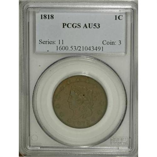<B>1818 1C AU53 PCGS.</B></I> PCGS Population (17/337). NGC Census: (3/338). Mintage: 3,167,000. Numismedia Wsl. Price for NGC/PCGS coin in AU53: $163. (#1600)<BR><BR><B>Coin Engraver:</B> Robert Scot or John Reich<BR><BR><b>Shipping:</b> Coins & Currency (<a target="_blank" href="http://www.heritageauctions.com/common/shipping.php">view shipping information</a>)