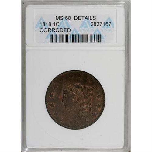 <B>1818 1C Brown--Corroded--ANACS. MS60 Details.</B></I> NGC Census: (2/282). PCGS Population (11/225). Mintage: 3,167,000. Numismedia Wsl. Price for NGC/PCGS coin in MS60: $217. (#1600)<BR><BR><B>Coin Engraver:</B> Robert Scot or John Reich<BR><BR><b>Shipping:</b> Coins & Currency (<a target="_blank" href="http://www.heritageauctions.com/common/shipping.php">view shipping information</a>)