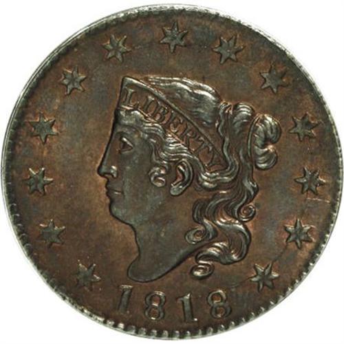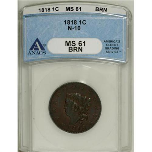 <B>1818 1C MS61 Brown ANACS.</B></I> N-10. NGC Census: (20/259). PCGS Population (12/207). Mintage: 3,167,000. Numismedia Wsl. Price for NGC/PCGS coin in MS61: $229. (#1600)<BR><BR><b>Shipping:</b> Coins & Currency (<a target="_blank" href="http://www.heritageauctions.com/common/shipping.php">view shipping information</a>)