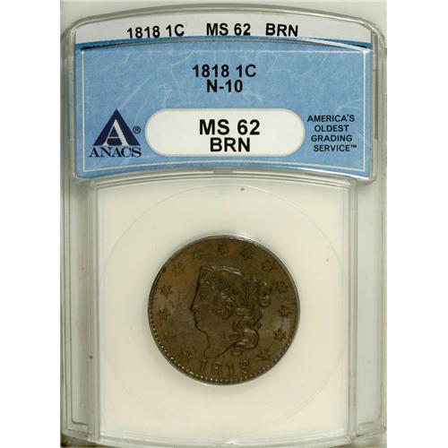 1818 1C MS62 Brown ANACS. N-10. NGC Census: (73/18