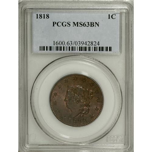 1818 1C MS63 Brown PCGS. N-10, R.1. This satiny Randal