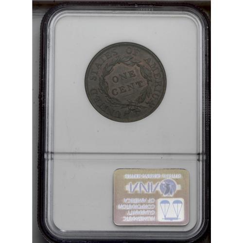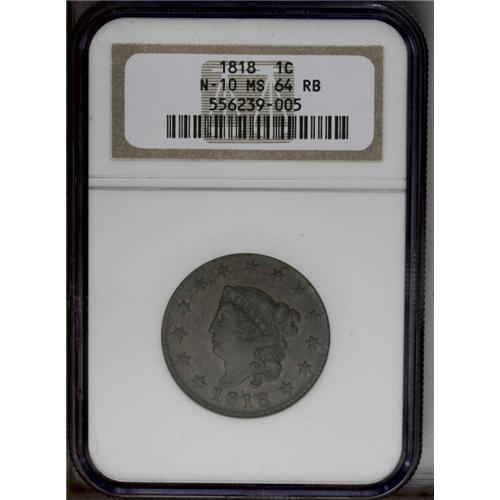 <B>1818<1C> MS64 Red and Brown NGC.</B></I> N-10, R.1. Faded mint red outlines the stars, legends, and devices. The portrait and open fields are toned deep steel-gray. The cheek has a moderate mark, but the overall appearance is smooth. Almost certainly from the famed Randall Hoard of Matron Head cents. EAC 60.<BR><I>From The Key Date Coin Collection.</B></I>