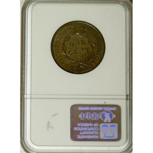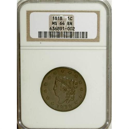<B>1818 1C MS64 Brown NGC.</B></I> N-10, R.1. Richly toned in mahogany, golden-brown, and forest-green shades. A satiny and lightly abraded near-Gem that presumably once belonged to the famous Randall Hoard. EAC 55.<BR><BR><B>Coin Engraver:</B> Robert Scot or John Reich<BR><BR><b>Shipping:</b> Coins & Currency (<a target="_blank" href="http://www.heritageauctions.com/common/shipping.php">view shipping information</a>)