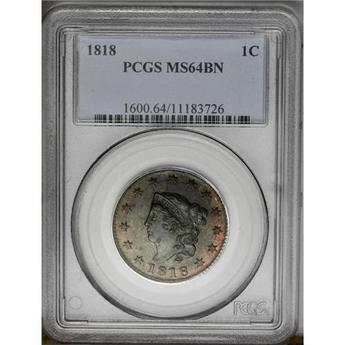 1818 1C MS64 Brown PCGS. N-10, R.1. A heavy die crack