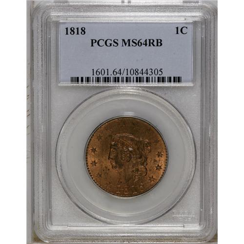 <B>1818 1C MS64 Red and Brown PCGS.</B></I> N-10, R.1. Die State b. The die cracks are diagnostic. The reddish-orange and brown surfaces have occasional dark spots on each side. EAC 62.<BR><BR><b>Shipping:</b> Coin/Currency (<a target="_blank" href="http://www.heritageauctions.com/common/shipping.php">view shipping information</a>)