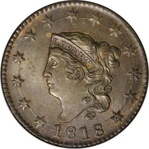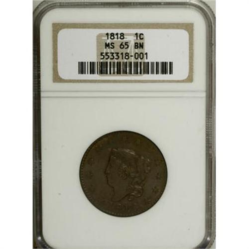 <B>1818 1C MS65 Brown NGC.</B></I> N-10, R.1. This sharply struck and satiny example presumably once contributed to the Randall Hoard. Designated as Brown by NGC, but glimpses of copper-red nevertheless emerge from design crevices. A few trivial ticks on the left obverse are only visible with an assist from a loupe. EAC 60.<BR><I>From The Arnold & Harriet Collection.</B></I><BR><BR><B>Coin Engraver:</B> Robert Scot or John Reich<BR><BR><b>Shipping:</b> Coins & Currency (<a target="_blank" href="http://www.heritageauctions.com/common/shipping.php">view shipping information</a>\)