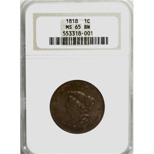 <B>1818 1C MS65 Brown NGC.</B></I> N-10, R.1. This sharply struck and satiny example presumably once contributed to the Randall Hoard. Designated as Brown by NGC, but glimpses of copper-red nevertheless emerge from design crevices. A few trivial ticks on the left obverse are only visible with an assist from a loupe. EAC 60.<BR><BR><B>Coin Engraver:</B> Robert Scot or John Reich<BR><BR><b>Shipping:</b> Coins & Currency (<a target="_blank" href="http://www.heritageauctions.com/common/shipping.php">view shipping information</a>)