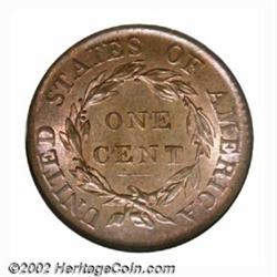1818 1C MS66 Red and Brown NGC. A Randall Hoard coin but one of the nicest examples we can remember having seen. This piece lacks the abrasions usually seen. The striking details are strong throughout, and the surfaces are smooth and satiny with a light overlay of brown patina on each side and significant portions of original red mint luster still present. Population: 1 in 66, 0 finer (7/02). Important notice: We expect to be auctioning lots at the rate of 200-250 per hour. Sometimes eBay Premier live bid software cannot keep up with that pace, so we strongly recommend that you place a realistic proxy bid now as insurance to avoid disappointment. Also please note that all Heritage/CAA lots purchased through eBay Premier carry a 20% Buyer's Premium. Please make sure you read the Terms and Conditions.