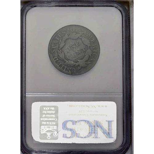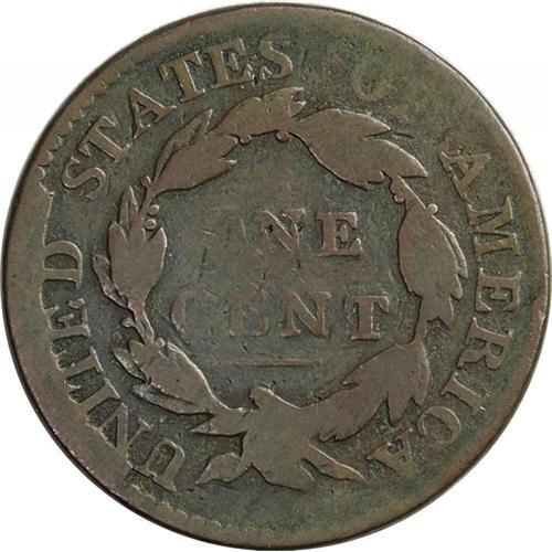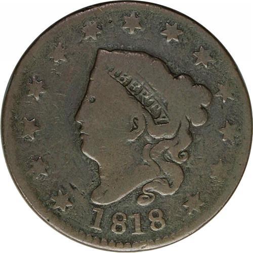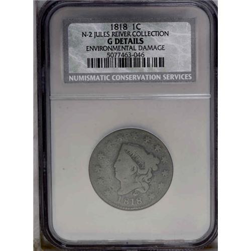 <B>1818<1C> N-2, R.4--Environmental Damage--NCS. Good Details. Good 5 EAC.</B></I> This is the terminal die state for the variety with a massive rim break beginning at the left top of N in UNITED and continuing to the first S in STATES. Moderately abraded with green and olive tones on both sides. Envelope Included.