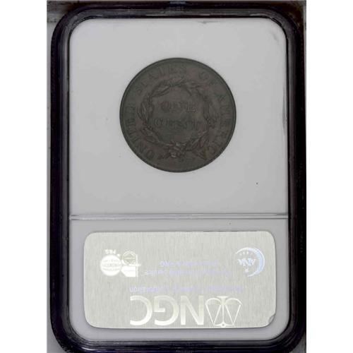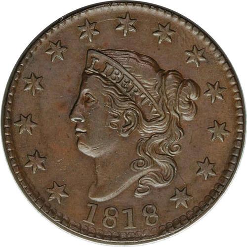 <B>1818<1C> N-7, R.1. AU58 NGC. XF45 EAC.</B></I> Somewhat later die state than the previous example, with slightly weakened border details. The center dot on the reverse is so weak that it is almost gone on this example. Lovely medium brown surfaces with some darker olive color and faint mahogany hues.<BR><I>Ex: Charles Dupont (Stack's, 9/1954), lot 563; Del Bland (7/19/1969).</B></I> Envelope Included.