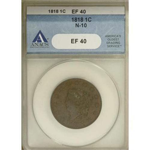 <B>1818 1C XF40 ANACS.</B></I> N-10. NGC Census: (2/361). PCGS Population (4/374). Mintage: 3,167,000. Numismedia Wsl. Price for NGC/PCGS coin in XF40: $104. (#1600)<BR><BR><B>Coin Engraver:</B> Robert Scot or John Reich<BR><BR><b>Shipping:</b> Coins & Currency (<a target="_blank" href="http://www.heritageauctions.com/common/shipping.php">view shipping information</a>)