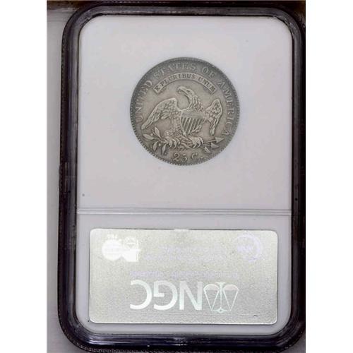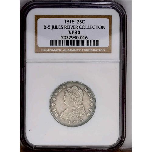 <B>1818<25C> B-5, R.5. VF30 NGC. Usual Die State.</B></I> Star 9 repunched; Stem tip right of center over C. Medium steel in color and attractive. There are a couple of minor nicks near the rim by stars two and three. Reverse crack from the rim through the D to the scroll below. A scarce variety in all grades.<BR><I>Ex: Paul Padget (1/1986).</B></I> Envelope Included.