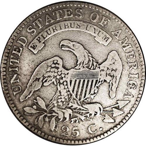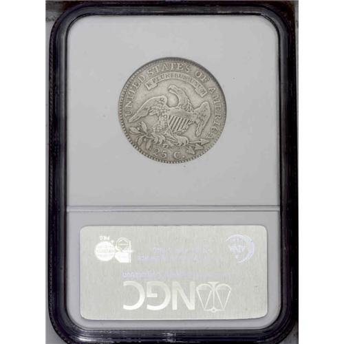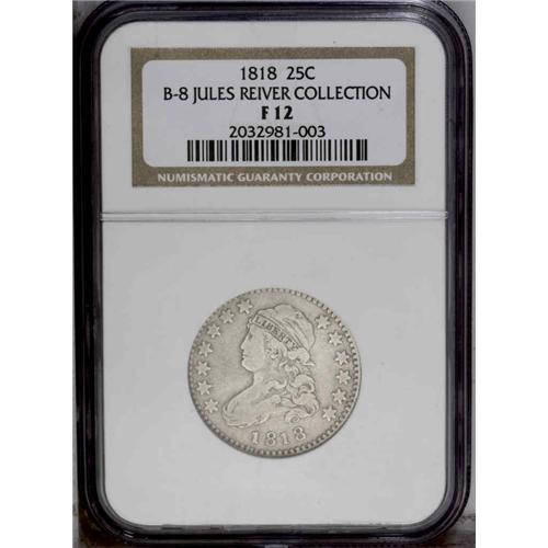 <B>1818<25C> B-8, R.3. Fine 12 NGC. Die State IV.</B></I> Three crowded dentils below first 1; D low, E of STATES high. Light gray with clean surfaces. A slightly later die state, with a small lump found on the leaf closest to the 2 in the denomination. The reverse die is no longer rotated.<BR><I>Ex: Goldberg (4/1988).</B></I> Envelope Included.