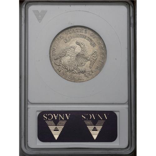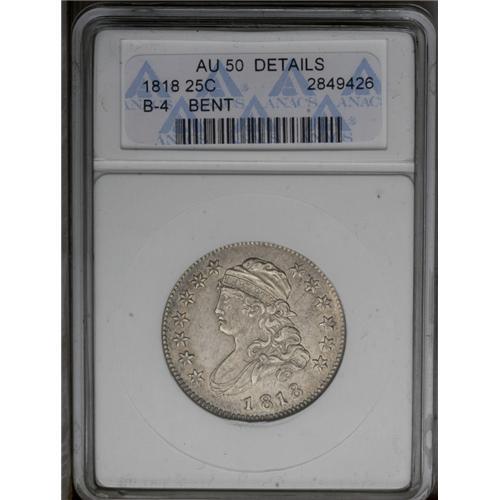 <B>1818<25C>--Bent--ANACS. AU50 Details.</B></I> B-4, R.2. This slate-gray Bust quarter has a few light hairlines, but the surfaces are only slightly wavy. The eagle's left (facing) leg is a bit sunken.