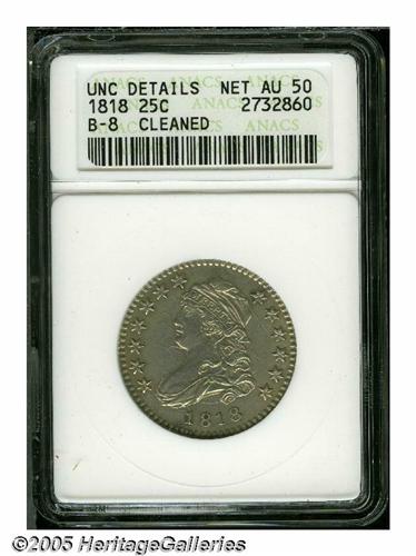 <B>1818<25C>--Cleaned--ANACS. Unc Details, Net AU50.</B></I> B-8, R.3. Gray-tan surfaces display fine hairlines. Nicely defined, and well centered. Both sides are clashmarked.<BR><I>From The Empire State Collection, Part Two.</B></I>