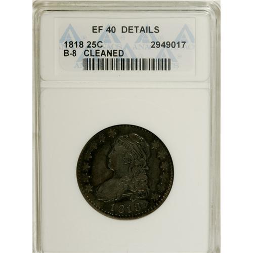 <B>1818 25C --Cleaned--ANACS. XF40 Details.</B></I> B-8. NGC Census: (14/232). PCGS Population (23/190). Mintage: 361,174. Numismedia Wsl. Price: $840. (#5322)<BR><BR><b>Shipping:</b> Coins & Currency (<a target="_blank" href="http://www.heritageauctions.com/common/shipping.php">view shipping information</a>)