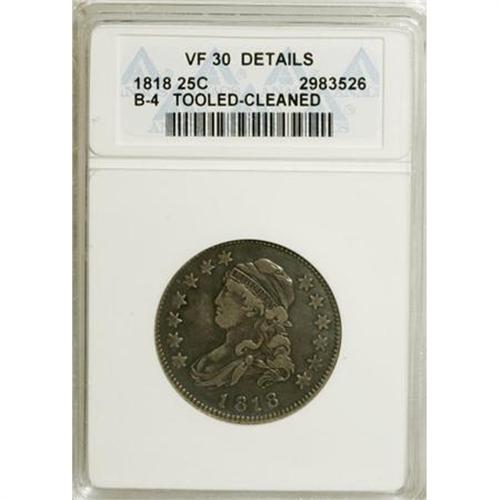 <B>1818 25C --Cleaned, Tooled--ANACS. VF30 Details.</B></I> B-4. NGC Census: (8/265). PCGS Population (17/229). Mintage: 361,174. Numismedia Wsl. Price for NGC/PCGS coin in VF30: $501. (#5322)<BR><BR><b>Shipping:</b> Coins & Currency (<a target="_blank" href="http://www.heritageauctions.com/common/shipping.php">view shipping information</a>)