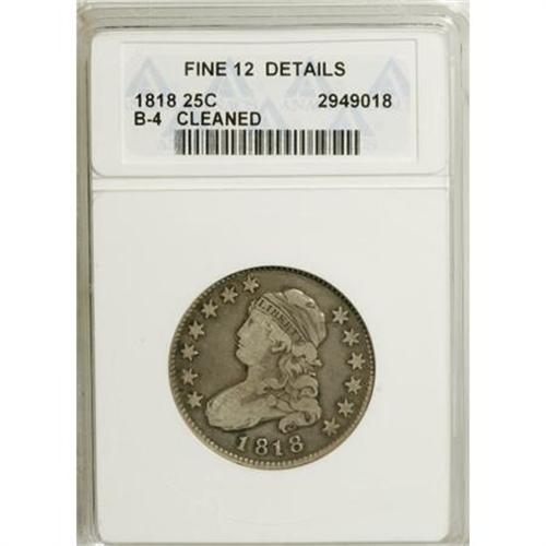 <B>1818 25C --Cleaned--ANACS. Fine 12 Details.</B></I> B-4. NGC Census: (13/308). PCGS Population (16/287). Mintage: 361,174. Numismedia Wsl. Price for NGC/PCGS coin in F12: $121. (#5322)<BR><BR><B>Coin Engraver:</B> John Reich<BR><BR><b>Shipping:</b> Coins & Currency (<a target="_blank" href="http://www.heritageauctions.com/common/shipping.php">view shipping information</a>\)