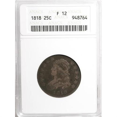 <B>1818 25C F12 ANACS.</B></I> NGC Census: (13/312). PCGS Population (17/301). Mintage: 361,174. Numismedia Wsl. Price for NGC/PCGS coin in F12: $121. (#5322)<BR><BR><B>Coin Engraver:</B> John Reich<BR><BR><b>Shipping:</b> Coins & Currency (<a target="_blank" href="http://www.heritageauctions.com/common/shipping.php">view shipping information</a>)