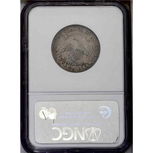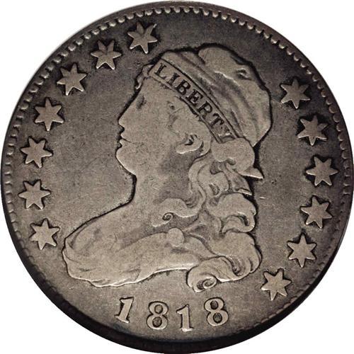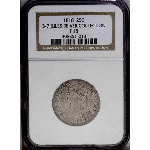 <B>1818<25C> Fine 15 NGC.</B></I> B-7, R.4. A scarce variety, Browning-7 has the first A in AMERICA aligned right with the end of the scroll, while the upright of the second 1 in the date is right aligned with the left edge of the shoulder curl. A hair-thin die crack, as made, through the left serifs of the N in UNITED, otherwise the dies are perfect. A circulated but unmarked lavender-gray example. E PLURIBUS UNUM is faint but fully readable. A small retained lamination is east of the date. Envelope Included.