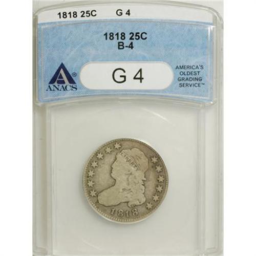 <B>1818 25C Good 4 ANACS.</B></I> <B>B-5, R.5. Incorrectly designated as B-4 by ANACS.</B></I> NGC Census: (0/331). PCGS Population (2/335). Mintage: 361,174. Numismedia Wsl. Price for NGC/PCGS coin in G4 : $60. (#5322)<BR><BR><B>Coin Engraver:</B> John Reich<BR><BR><b>Shipping:</b> Coins & Currency (<a target="_blank" href="http://www.heritageauctions.com/common/shipping.php">view shipping information</a>\)