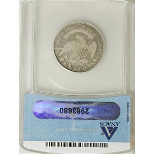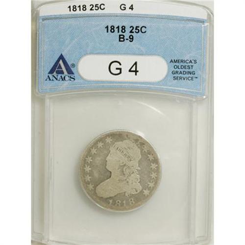 <B>1818 25C Good 4 ANACS.</B></I> B-9, R.4. Breen Die State II with heavy die clash of the arrows and 25 C above Liberty's cap. The base of the date and the edges of stars 8 and 9 approach the rim, but LIBERTY is bold, and the tail feathers have partial definition.<BR><BR><b>Shipping:</b> Coins & Currency (<a target="_blank" href="http://www.heritageauctions.com/common/shipping.php">view shipping information</a>)