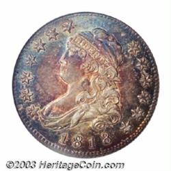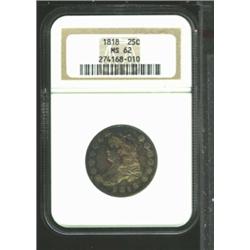 <TABLE cellSpacing=0 cellPadding=0 width="100%" bgColor=#000000 border=0><TBODY><TR><TD width="100%"><TABLE cellSpacing=1 cellPadding=3 width="100%" border=0><TBODY><TR><TD width="100%" bgColor=#79735c><FONT face=arial color=#ffffff size=3><B>Description</B> </FONT></TD></TR><TR><TD width="100%" bgColor=#ffffff><FONT face=arial size=2><B>1818 25C MS62 NGC.</B></I> B-2a, Low R.3. Most easily attributable by doubling on star 13 and the prominent die crack around much of the obverse rim. The 1818 is a popular date for type purposes with 361,174 pieces struck and ten known die varieties. This piece is a bit softly struck over the highpoints, and each side has dramatic deep blue, golden, and magenta toning with strong underlying mint luster. </FONT></TD></TR></TBODY></TABLE></TD></TR></TBODY></TABLE><BR><A name=PricesRealized></A><TABLE cellSpacing=0 cellPadding=0 width="100%" bgColor=#000000 border=0><TBODY><TR><TD width="100%"><TABLE cellSpacing=1 cellPadding=3 width="100%" border=0><TBODY><TR><TD width="100%" bgColor=#79735c><A name=PR><FONT face=arial color=#ffffff size=3><B>Previous Prices from Heritage Auctions</B> </FONT></A></TD></TR><TR><TD bgColor=#f6f6ed><TABLE cellSpacing=0 cellPadding=0 width="100%" border=1><TBODY><TR><TD align=middle width="33%"><B>Date</B></TD><TD align=middle width="33%"><B>Service</B></TD><TD align=middle width="33%"><B>Price</B></TD></TR><TR bgColor=whitesmoke><TD width="33%"><B>01/08/2002</B></TD><TD width="33%">PCGS</TD><TD width="33%">$2,990.00</TD></TR><TR bgColor=whitesmoke><TD width="33%"><B>01/11/1997</B></TD><TD width="33%">NGC</TD><TD width="33%">$1,725.00</TD></TR></TBODY></TABLE></TD></TR><TR><TD bgColor=#ffffff><FONT face=arial size=1 ?>PLEASE NOTE: All prices realized reflect the final hammer price PLUS the buyer's premium in auctions that charge a buyer's premium. Each item has a notation at the top of the listing indicating whether that lot included a buyer's premium. Example: A item that sells with a final hammer price of $100 and a 20% buyer's premium will display with a price realized of $120. All information listed is intended to be as accurate as possible, but errors are possible. Please use this guide carefully and inform us of any inaccuracies. </FONT></TD></TR></TBODY></TABLE></TD></TR></TBODY></TABLE><BR><TABLE cellSpacing=0 cellPadding=0 width="100%" bgColor=#000000 border=0><TBODY><TR><TD width="100%"><TABLE cellSpacing=1 cellPadding=3 width="100%" border=0><TBODY><TR><TD width="100%" bgColor=#79735c colSpan=6><FONT face=arial color=#ffffff size=3><B>Price Guide*</B> </FONT></TD></TR><TR bgColor=#f6f6ed><TD align=middle><B>Grade</B> </TD><TD align=middle><B>Coin World<BR>(Trends)</B> </TD><TD align=middle><B>Numismedia<BR>Retail</B> </TD><TD align=middle><B>Numismedia<BR>Wholesale</B> </TD><TD align=middle><B>Coin<BR>Universe</B> </TD><TD align=middle><B>Heritage<BR>Value Index</B> </TD></TR><TR bgColor=#ffffff><TD align=middle>61</TD><TD align=right>---</TD><TD align=right>---</TD><TD align=right>$1,875.00</TD><TD align=right>---</TD><TD align=right>$1,710.83</TD></TR><TR style="FONT-WEIGHT: bold" bgColor=#cccfdd><TD align=middle>62</TD><TD align=right>$2,250.00</TD><TD align=right>---</TD><TD align=right>$2,325.00</TD><TD align=right>$3,000.00</TD><TD align=right>$1,970.00</TD></TR><TR bgColor=#ffffff><TD align=middle>63</TD><TD align=right>$3,825.00</TD><TD align=right>---</TD><TD align=right>$2,975.00</TD><TD align=right>$4,200.00</TD><TD align=right>$2,742.50</TD></TR><TR bgColor=#ffffff><TD colSpan=6><FONT size=1>*All information listed is intended to be as accurate as possible, but errors are possible. No item may be returned or refused based on this information which is provided as a service to our customers. You should contact each pricing source directly to determine the accuracy of this information. </FONT></TD></TR></TBODY></TABLE></TD></TR></TBODY></TABLE><BR><TABLE cellSpacing=0 cellPadding=0 width="100%" bgColor=#000000 border=0><TBODY><TR><TD width="100%"><TABLE cellSpacing=1 cellPadding=3 width="100%" border=0><TBODY><TR><TD width="100%" bgColor=#79735c><FONT face=arial color=#ffffff size=3><B>Population Guide</B> </FONT></TD></TR><TR bgColor=#ffffff><TD align=middle><!-- Begin Output of Population Grid--><TABLE cellSpacing=0 cellPadding=0 width="100%" border=0><TBODY><TR><TD vAlign=center><TABLE cellSpacing=0 width="100%" border=1 cellsadding="3"><TBODY><TR><TD vAlign=center><TABLE cellSpacing=0 cellPadding=3 width="100%" border=1><TBODY><TR><TD vAlign=center align=middle bgColor=#f0f1e8 colSpan=2 <CENTER><FONT face=Arial size=2><B>PCGS Pop </B></FONT><CENTER></CENTER></TD><TD vAlign=center align=middle bgColor=#f0f1e8 colSpan=2><CENTER><FONT face=Arial size=2><B>NGC Pop</B></CENTER></FONT></TD></TR><TR><TD vAlign=center><FONT face=Arial size=2>(62)</FONT> </TD><TD vAlign=center align=right><FONT face=Arial size=2>9</FONT> </TD><TD vAlign=center><FONT face=Arial size=2>(62)</FONT> </TD><TD vAlign=center align=right><FONT face=Arial size=2>9</FONT> </TD></TR><TR><TD vAlign=center><FONT face=Arial size=2>(>62)</FONT> </TD><TD vAlign=center align=right><FONT face=Arial size=2>87</FONT> </TD><TD vAlign=center><FONT face=Arial size=2>(>62)</FONT> </TD><TD vAlign=center align=right><FONT face=Arial size=2>87</FONT> </TD></TR></TBODY></TABLE></TD></TR></TBODY></TABLE></TD></TR></TBODY></TABLE><!-- End Output of Population Grid--> Important notice: Heritage usually auctions material at the rate of 200-250 lots per hour. On some occasions eBay Live bid software or the Internet may not be able to keep up with the pace of the auction. We recommend placing a realistic absentee bid now as insurance to avoid disappointment. Occasionally the auctioneer may eliminate or reject an eBay Live bid, and the auctioneer may also reopen a lot after the close of the eBay live bidding (usually because we missed an audience bid), and may reject your bid even if it shows you as the winning bidder. By bidding via eBay Live, you agree that Her