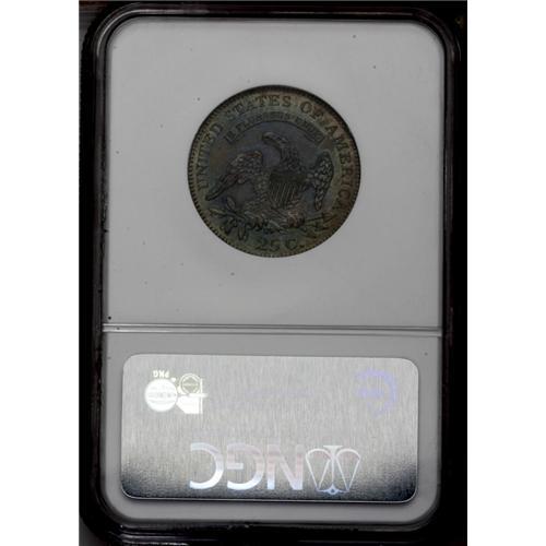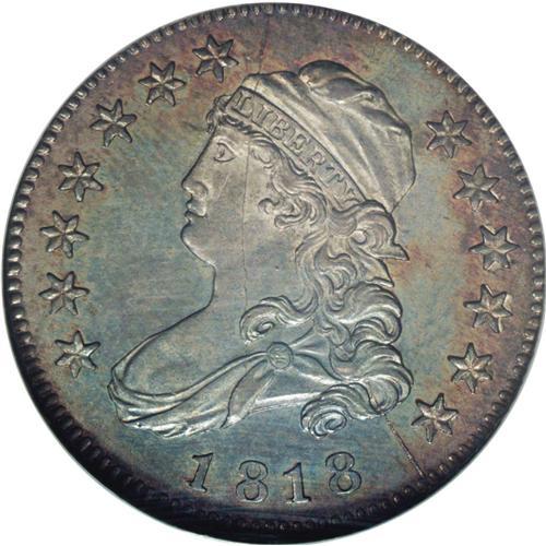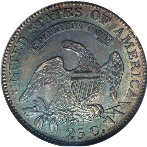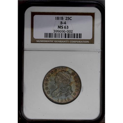 <B>1818<25C> MS63 NGC.</B></I> B-4, R.2. Die State VII, which Breen considered very rare. The obverse displays bold die cracks across the portrait and from the rim at 5 o'clock to the shoulder. The reverse die is multiply clashed and a cud affects several dentils northwest of the M in AMERICA. Vivid rose-gold and forest-green toning embraces this sharply struck type coin. The surfaces are clean save for a minor thin handling mark in the field near the eagle's beak.<BR><I>From The Lake Highlands Collection.</B></I> <BR><BR><B>Importa