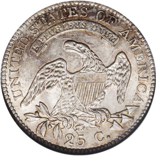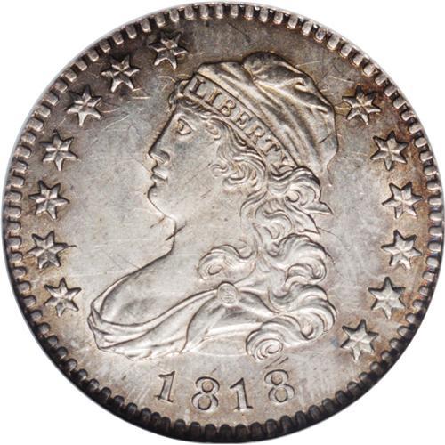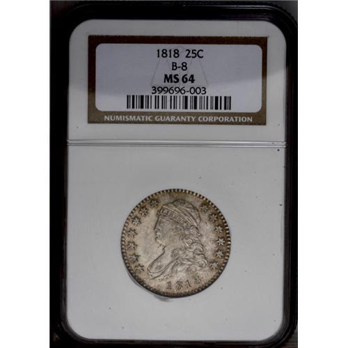 <B>1818<25C> MS64 NGC.</B></I> B-8, R.3. Die State III. Golden-brown and pearl-gray enriches this attractive near-Gem. The strike is intricate save for the claws and selected highpoints of the cap and drapery. A couple of faint marks on the cheek, but overall, the surfaces are refreshingly smooth. Although B-8 is not rare in VF, Uncirculated examples are a different matter. NGC has certified 11 pieces as B-8, and aside from the present coin, the second finest is graded AU53 (2/06).<BR><I>From The Lake Highlands Collection.</B></I> <BR><BR><B>Importa