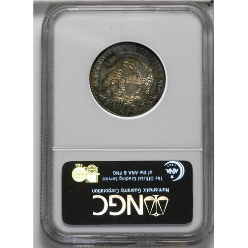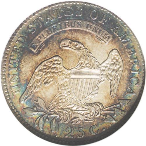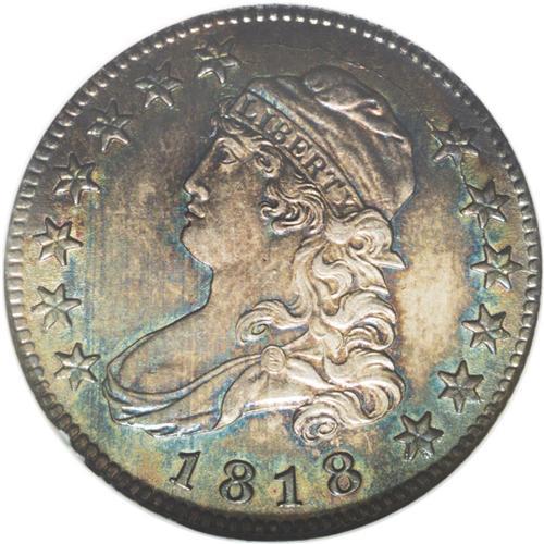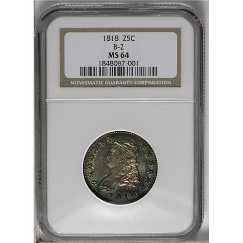 <B>1818<25C> MS64 NGC.</B></I> B-2, R.1. Lavish ocean-blue, lilac, and golden-tan endow this crisply struck and glistening near-Gem. The occasional thin mark is located upon exhausting examination beneath a loupe, but these are inconspicuous to the unaided eye. The Large Diameter Capped Bust quarter is a difficult type to locate in Mint State.<BR><I>Ex: J.H. South Collection (Stack's, 5/51), lot 407.</B></I><BR><I>From The Redfjord Collection.</B></I>