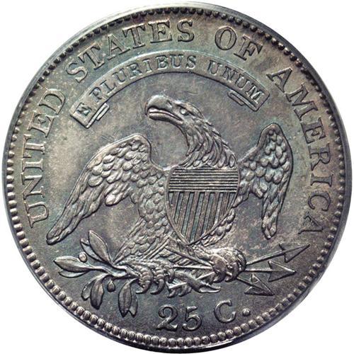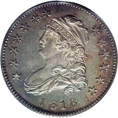 <B>1818<25C> MS64 PCGS.</B></I> B-4, R.2. Die State VII, which Breen considered very rare. The obverse displays bold die cracks across the portrait and from the rim at 5 o'clock to the shoulder. The reverse die is multiply clashed and a cud affects several dentils northwest of the M in AMERICA. Deep rose-gold and forest-green toning embraces this sharply struck type coin. The surfaces are clean save for a minor thin handling mark in the field near the eagle's beak.