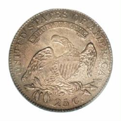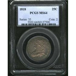 <TABLE cellSpacing=0 cellPadding=0 width="100%" bgColor=#000000 border=0><TBODY><TR><TD width="100%"><TABLE cellSpacing=1 cellPadding=3 width="100%" border=0><TBODY><TR><TD width="100%" bgColor=#79735c><FONT face=arial color=#ffffff size=3><B>Description</B> </FONT></TD></TR><TR><TD width="100%" bgColor=#ffffff><FONT face=arial size=2><B>1818 25C MS64 PCGS.</B></I> B-3, R.1. While 1818 quarters may be one of the more available dates of the Capped Bust type, high grade examples of this variety are anything but common. The Condition Census listed in the most recent update of Browning is (65, 63, 60, 60, 60, 60), placing this piece at the upper end of known specimens. This is a splendid example that has smooth, satiny mint luster that is overlaid by rich rose and gray-lilac toning. Sharply impressed around the peripheries, there is some striking weakness on Liberty's hair as well as the eagle's plumage, as one would expect. An important and original example of this variety. </FONT></TD></TR></TBODY></TABLE></TD></TR></TBODY></TABLE><BR><A name=PricesRealized></A><TABLE cellSpacing=0 cellPadding=0 width="100%" bgColor=#000000 border=0><TBODY><TR><TD width="100%"><TABLE cellSpacing=1 cellPadding=3 width="100%" border=0><TBODY><TR><TD width="100%" bgColor=#79735c><A name=PR><FONT face=arial color=#ffffff size=3><B>Previous Prices from Heritage Auctions</B> </FONT></A></TD></TR><TR><TD bgColor=#f6f6ed><TABLE cellSpacing=0 cellPadding=0 width="100%" border=1><TBODY><TR><TD align=middle width="33%"><B>Date</B></TD><TD align=middle width="33%"><B>Service</B></TD><TD align=middle width="33%"><B>Price</B></TD></TR><TR bgColor=whitesmoke><TD width="33%"><B>08/13/1996</B></TD><TD width="33%">NGC</TD><TD width="33%">$2,530.00</TD></TR><TR bgColor=whitesmoke><TD width="33%"><B>01/10/1998</B></TD><TD width="33%">NGC</TD><TD width="33%">$4,025.00</TD></TR><TR bgColor=whitesmoke><TD width="33%"><B>08/07/2000</B></TD><TD width="33%">PCGS</TD><TD width="33%">$5,175.00</TD></TR><TR bgColor=whitesmoke><TD width="33%"><B>02/18/2002</B></TD><TD width="33%">PCGS</TD><TD width="33%">$5,290.00</TD></TR><TR bgColor=whitesmoke><TD width="33%"><B>08/17/1996</B></TD><TD width="33%">PCGS</TD><TD width="33%">$6,325.00</TD></TR><TR bgColor=whitesmoke><TD width="33%"><B>08/07/1998</B></TD><TD width="33%">PCGS</TD><TD width="33%">$8,625.00</TD></TR><TR bgColor=whitesmoke><TD width="33%"><B>01/25/2000</B></TD><TD width="33%">NGC</TD><TD width="33%">$3,200.00</TD></TR><TR bgColor=whitesmoke><TD width="33%"><B>03/23/2003</B></TD><TD width="33%">NGC</TD><TD width="33%">$3,565.00</TD></TR></TBODY></TABLE></TD></TR><TR><TD bgColor=#ffffff><FONT face=arial size=1 ?>PLEASE NOTE: All prices realized reflect the final hammer price PLUS the buyer's premium in auctions that charge a buyer's premium. Each item has a notation at the top of the listing indicating whether that lot included a buyer's premium. Example: A item that sells with a final hammer price of $100 and a 20% buyer's premium will display with a price realized of $120. All information listed is intended to be as accurate as possible, but errors are possible. Please use this guide carefully and inform us of any inaccuracies. </FONT></TD></TR></TBODY></TABLE></TD></TR></TBODY></TABLE><BR><TABLE cellSpacing=0 cellPadding=0 width="100%" bgColor=#000000 border=0><TBODY><TR><TD width="100%"><TABLE cellSpacing=1 cellPadding=3 width="100%" border=0><TBODY><TR><TD width="100%" bgColor=#79735c colSpan=6><FONT face=arial color=#ffffff size=3><B>Price Guide*</B> </FONT></TD></TR><TR bgColor=#f6f6ed><TD align=middle><B>Grade</B> </TD><TD align=middle><B>Coin World<BR>(Trends)</B> </TD><TD align=middle><B>Numismedia<BR>Retail</B> </TD><TD align=middle><B>Numismedia<BR>Wholesale</B> </TD><TD align=middle><B>Coin<BR>Universe</B> </TD><TD align=middle><B>Heritage<BR>Value Index</B> </TD></TR><TR bgColor=#ffffff><TD align=middle>63</TD><TD align=right>$3,825.00</TD><TD align=right>---</TD><TD align=right>$2,975.00</TD><TD align=right>$4,200.00</TD><TD align=right>$2,742.50</TD></TR><TR style="FONT-WEIGHT: bold" bgColor=#cccfdd><TD align=middle>64</TD><TD align=right>$5,500.00</TD><TD align=right>---</TD><TD align=right>$4,200.00</TD><TD align=right>$6,500.00</TD><TD align=right>$4,121.25</TD></TR><TR bgColor=#ffffff><TD align=middle>65</TD><TD align=right>$15,000.00</TD><TD align=right>---</TD><TD align=right>$10,500.00</TD><TD align=right>$21,000.00</TD><TD align=right>$11,580.00</TD></TR><TR bgColor=#ffffff><TD colSpan=6><FONT size=1>*All information listed is intended to be as accurate as possible, but errors are possible. No item may be returned or refused based on this information which is provided as a service to our customers. You should contact each pricing source directly to determine the accuracy of this information. </FONT></TD></TR></TBODY></TABLE></TD></TR></TBODY></TABLE><BR><TABLE cellSpacing=0 cellPadding=0 width="100%" bgColor=#000000 border=0><TBODY><TR><TD width="100%"><TABLE cellSpacing=1 cellPadding=3 width="100%" border=0><TBODY><TR><TD width="100%" bgColor=#79735c><FONT face=arial color=#ffffff size=3><B>Population Guide</B> </FONT></TD></TR><TR bgColor=#ffffff><TD align=middle><!-- Begin Output of Population Grid--><TABLE cellSpacing=0 cellPadding=0 width="100%" border=0><TBODY><TR><TD vAlign=center><TABLE cellSpacing=0 width="100%" border=1 cellsadding="3"><TBODY><TR><TD vAlign=center><TABLE cellSpacing=0 cellPadding=3 width="100%" border=1><TBODY><TR><TD vAlign=center align=middle bgColor=#f0f1e8 colSpan=2 <CENTER><FONT face=Arial size=2><B>PCGS Pop </B></FONT><CENTER></CENTER></TD><TD vAlign=center align=middle bgColor=#f0f1e8 colSpan=2><CENTER><FONT face=Arial size=2><B>NGC Pop</B></CENTER></FONT></TD></TR><TR><TD vAlign=center><FONT face=Arial size=2>(64)</FONT> </TD><TD vAlign=center align=right><FONT face=Arial size=2>44</FONT> </TD><TD vAlign=center><FONT face=Arial size=2>(64)</FONT> </TD><TD vAlign=center align=right><FONT face=Arial size=2>46</FONT> </TD>