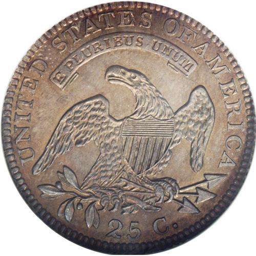 <B>1818<25C> MS65 NGC.</B></I> B-10, R.3. This needle-sharp Gem features dusky apricot toning and comprehensive satin luster. The reverse is essentially immaculate aside from a trivial slide mark or two beneath the eagle's beak, and the obverse has only the most inconsequential contact. Multiple sets of clash marks in the fields are of Mint origin, as is a slender vertical die crack from the rim through the 2 in the denomination to the border of the shield. A perusal of Heritage auction records over the past decades does not locate any prior Mint State examples of Browning-10. The importance of the present piece cannot be overemphasized, since another of its quality may not appear at auction for many years.<BR><I>From The Lake Highlands Collection.</B></I>